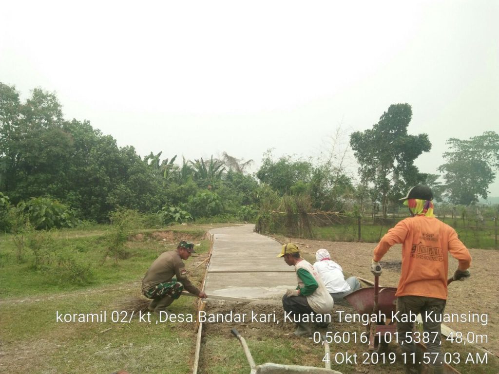 Teluk Kuantan, Indonesia–Babinsa Koramil 02/KT, Serma Damhuri melaksanakan gotong- royong (Goro) pembuatan jalan semenisasi menuju ke perkebunan masyarakat bersama warga Desa Bandar Alai Kari, Kecamatan Kuantan Tengah, Kabupaten Kuantan Singingi (Kuansing), Provinsi Riau.