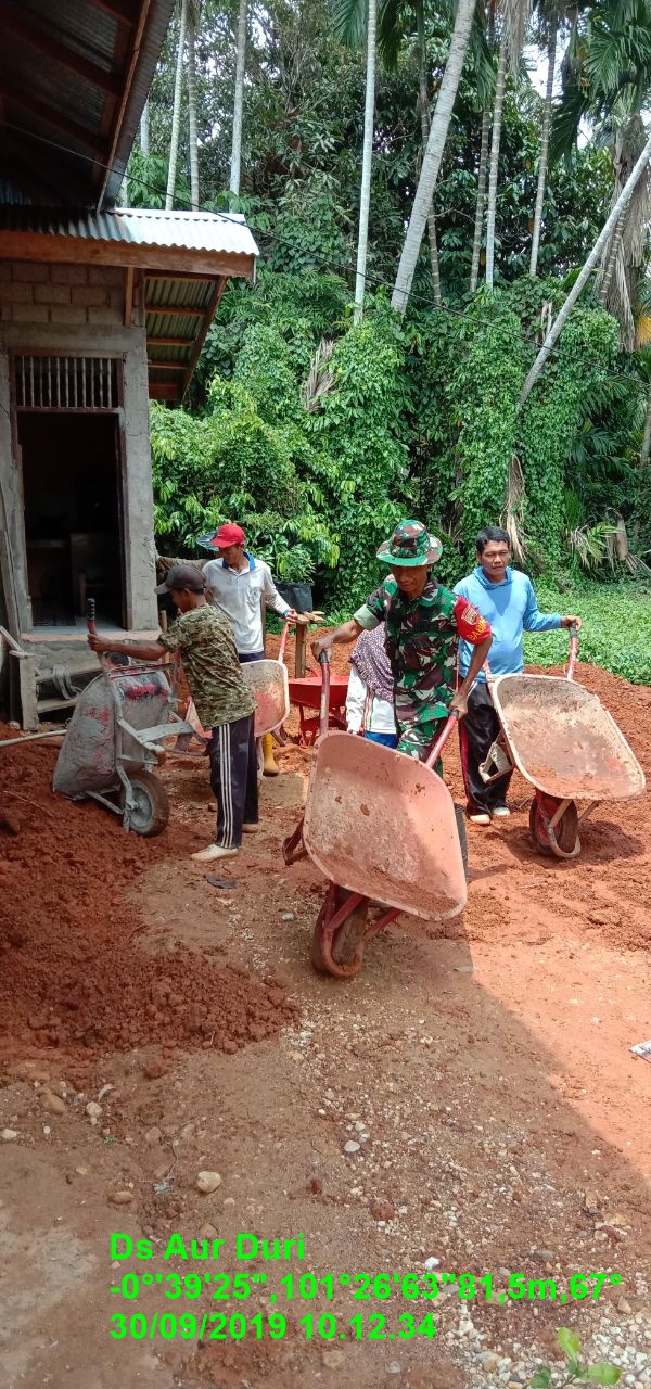 Kuantan Mudik, Indonesia–Babinsa Koramil 08/Kuantan Mudik Kodim 0302/Inhu Serda Tarmizi melaksanakan kegiatan Komunikasi Sosial (Komsos) karya bakti bersama masyarakat, dengan sasaran penimbunan halaman rumah Endrius di Desa Aur Duri, Kecamatan Kuantan Mudik, Kabupaten Kuantan Singingi (Kuansing), Provinsi Riau, Senin(30/09/2019).