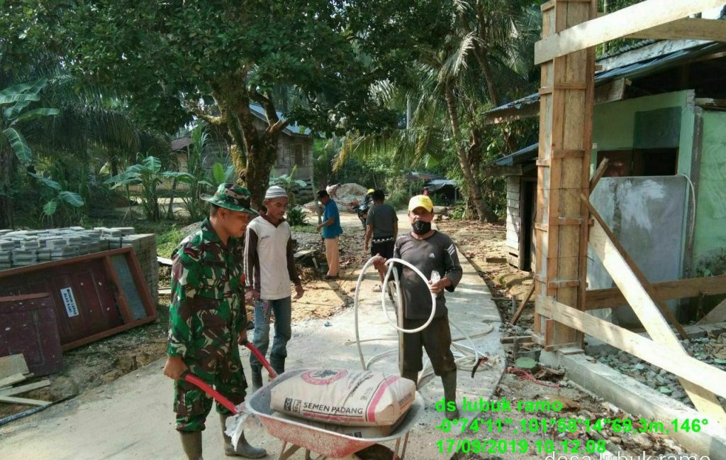 Kuantan Mudik, Indonesia–Babinsa Koramil 08/KM Sertu Asri Efendi bersama warga melaksanakan kerja bakti gotong royong (Goro) membuat tempat wudhu di Mesjid Al Munir, Desa Lubuk Ramo, Kecamatan Kuantan Mudik, Kabupaten Kuantan Singingi (Kuansing), Selasa (17/09/19).