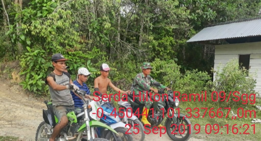 Singingi, Indonesia–Babinsa Koramil 09/Sgg Serda Hilton melaksanakan Patroli Dan Sosialisasi Pencegahan kebakaran hutan dan lahan (Karhutla) di Desa Sumber Datar, Kecamatan Singingi Hilir, Kabupaten Kuantan Singingi (Kuansing), Provinsi Riau, Rabu (25-9-2019).