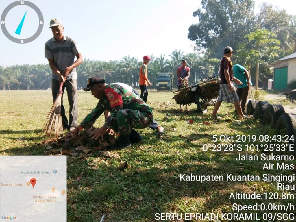 Singingi, Indonesia–Babinsa Koramil 09/Sgg Sertu Epriadi Sabtu (05/10/2019) melaksanakan gotong royong (Goro) membersikan lapangan untuk mempersiapkan pengajian akbar di Desa Air Emas, Kecamatan Singingi, Kabupaten Kuantan Singingi (Kuansing), Provinsi Riau. Penceramah Ustad Abdul Somad (UAS).