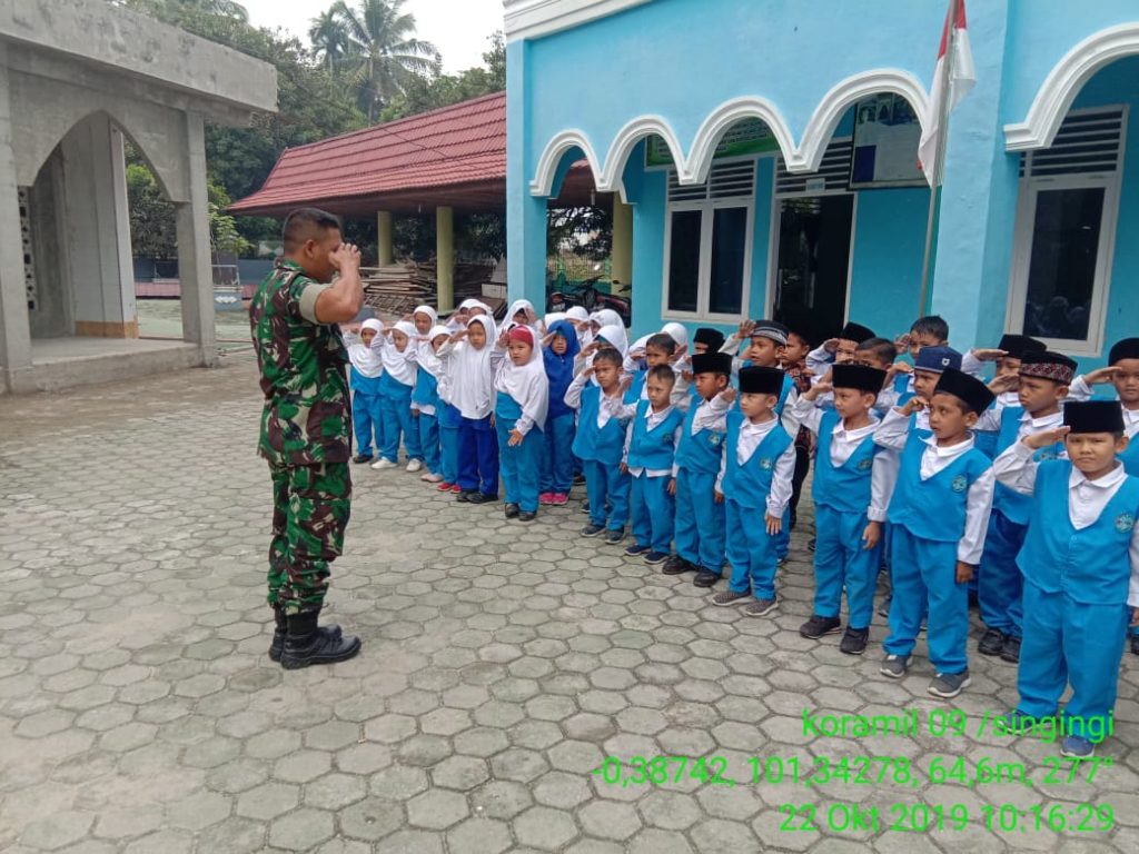 Muara Lembu, Indonesia–Serda M Aprinto mendampingi guru TK/Radiatul Atifa dalam proses belajar dan bermain di Kelurahan Muara Lembu Kecamatan Singingi, Kabupaten Kuantan Singingi (Kuansing), Provinsi Riau, Rabu (22/10/2019).