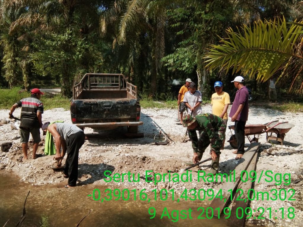 Babinsa Koramil 09/Sgg Sertu Epriadi, Jumat (09/08/2019) melaksanakan Goro bersama masyarakat mencari batu kerikil untuk menimbun jalan.