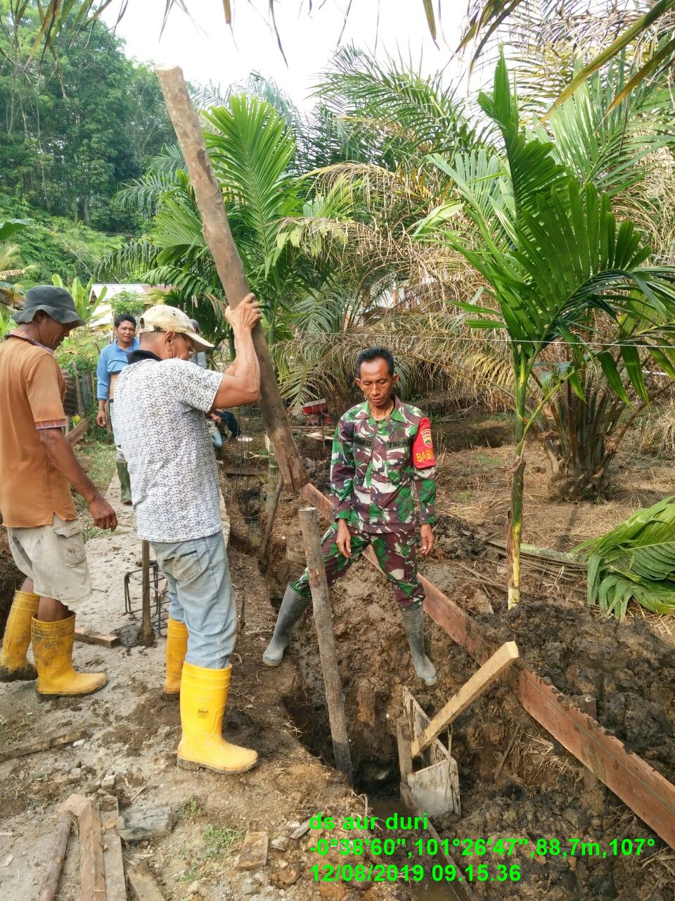 Kuansing, Indonesia–Babinsa Koramil 08/Kuantan Mudik Serda Tarmizi dan Serda Agus Supriadi melaksanakan Gotong Royong (Goro) bersama masyarakat mengerjakan semenisasi jalan di Desa Aur Duri, Kecamatan Kuantan Mudik, Kabupaten Kuantan Singingi (Kuansing), Provinsi Riau.
