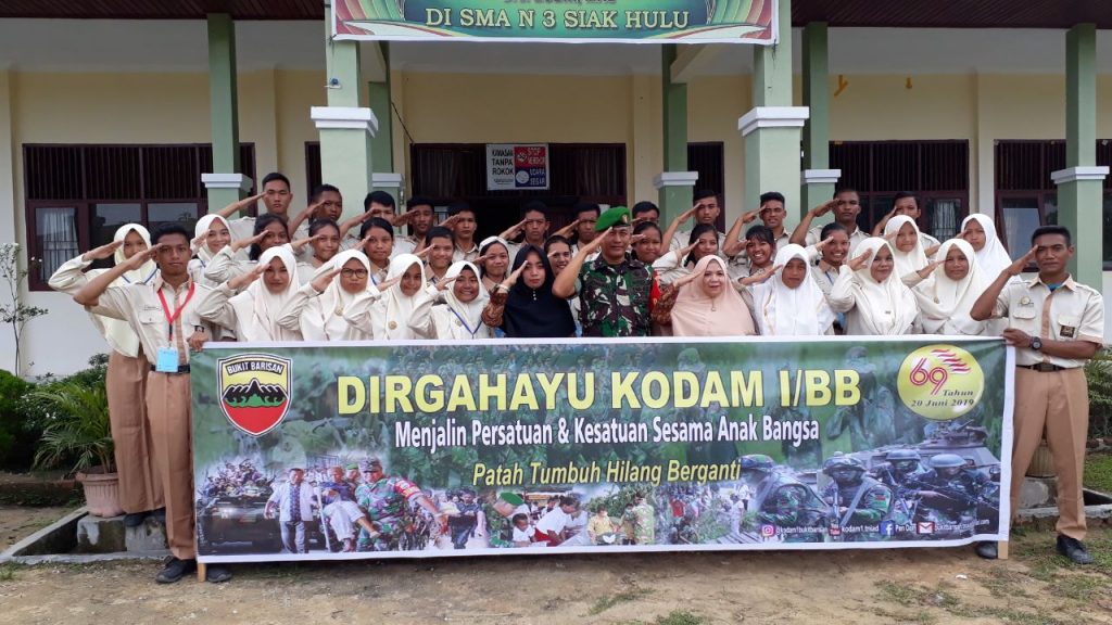 Siak Hulu, Indonesia – Koramil 06/Siak Hulu (SH) ikut berperan aktif mensukseskan Hari Ulang Tahun (HUT) Kodam I/BB (Bukit Barisan) dengan melaksanakan Komsos kreatif bersama masyarakat dan pelajar. Lokasi kegiatan terletak di Desa Pandau Jaya dan Desa Teratak Bulu, Kecamatan Siak Hulu.