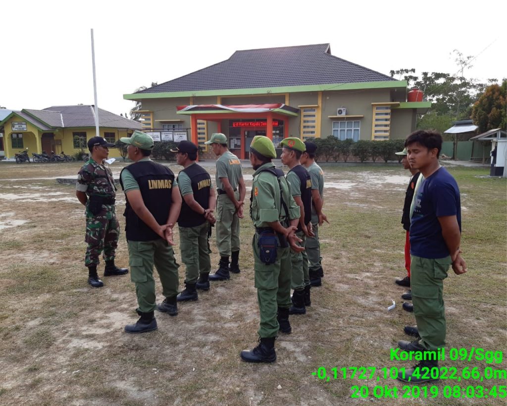 Demi melatih kedisiplinan perlindungan masyarakat (Linmas), Babinsa Suka Maju Kecamatan Singingi Hilir Sertu Abd Hasyim memberikan pelatihan Peraturan Baris-Berbaris (PBB) di desa binaan, Minggu (20/10/19).