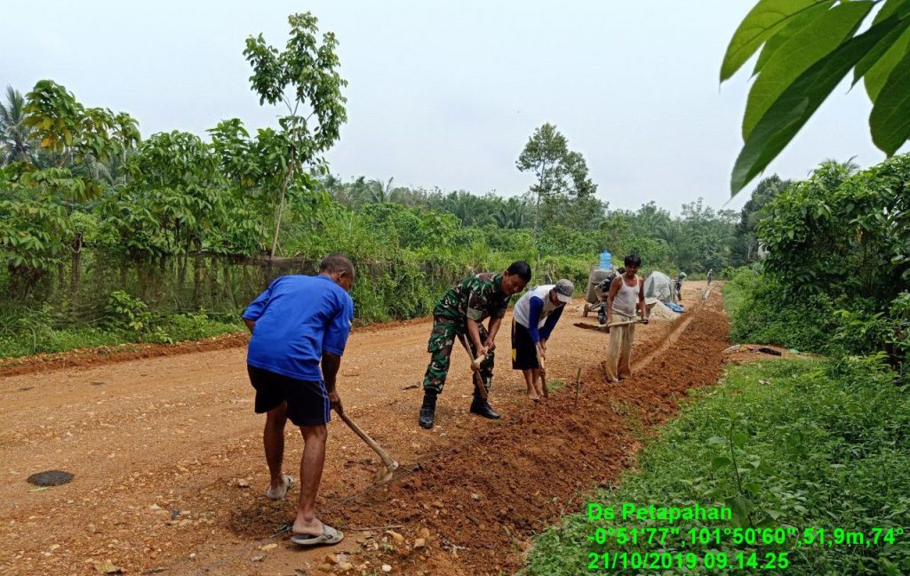 Kuantan Mudik, Indonesia–Bintara Pembina Desa (Babinsa) Koramil 08/Kuantan Mudik Pelda Doli Mulyono melaksanakan gotong royong (Goro) perbaikan ruas jalan Desa Petapahan bersama masyarakat di Desa Petapahan, Kecamatan Gunung Toar, Kabupaten Kuantan Singingi (Kuansing), Provinsi Riau, Senin (21.10.19).