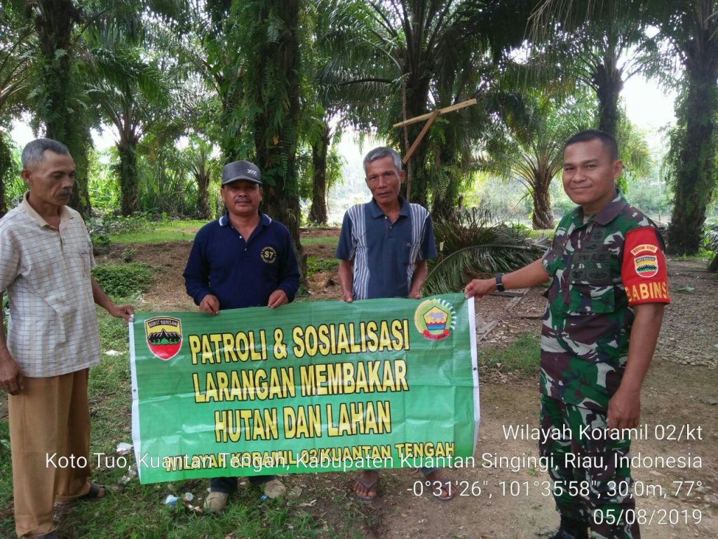 Babinsa Sertu Aidil Fitri menghimbau masyarakat tentang bahaya membakar lahan pada saat musim kemarau, sehingga mengurangi keinginan warga untuk membakar lahan dan hutan, juga mencegah terjadinya musibah kebakaran. “Selain melaksanakan patroli, Babinsa juga melakukan sosialisasi dan himbauan kepada warga yang memiliki kebun dan ladang, agar tidak membuka lahan dengan cara dibakar,” pungkas Sertu Aidil Fitri. rls