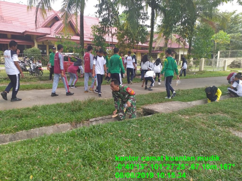 Seperti yang dilaksanakan Serda Tarmizi di sela-sela latihan bersama seluruh calon anggota Paskibraka kali ini, mereka tampak melaksanakan gotong royong membersihkan lingkungan Kantor Camat Kuantan Mudik.
