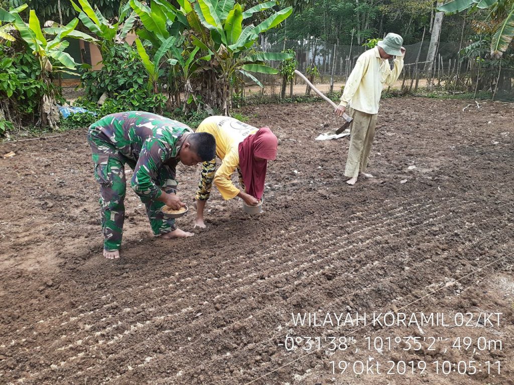 Kuantan Tengah, Indonesia–Babinsa Ramil 02/KT turut membantu petani melaksanakan penyemaian bibit padi di Kuantan Tengah, Kabupaten Kuantan Singingi (Kuansing), Provinsi Riau, Sabtu (19/10-2019).