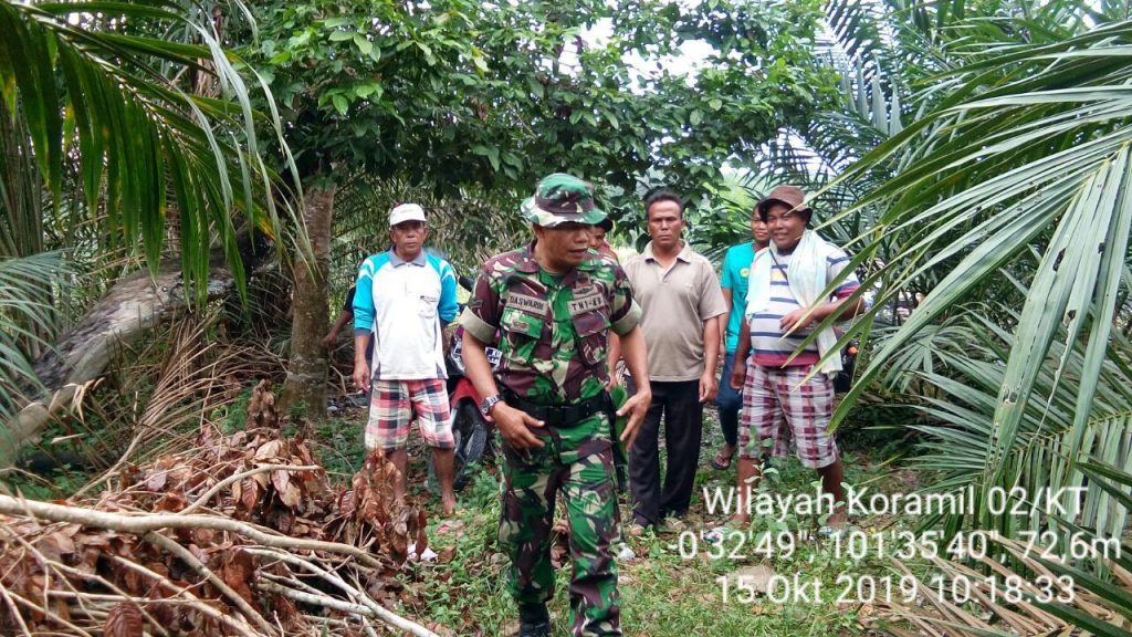 Teluk Kuantan, Indonesia–Guna mencegah agar tidak terjadi kembali bencana kebakaran hutan dan lahan (Karhutla), Anggota Koraml 02/KT Pelda Syafriantoni bersama masyarakat melaksanakan patroli di wilayah yang rawan terbakar. Salah satu sasaran patrol, Desa Sebrang Taluk, Kecamatan Kuantan Tengah, Kabupaten Kuantan Singingi (Kuansing), Provinsi Riau), Selasa (15/10-2019).