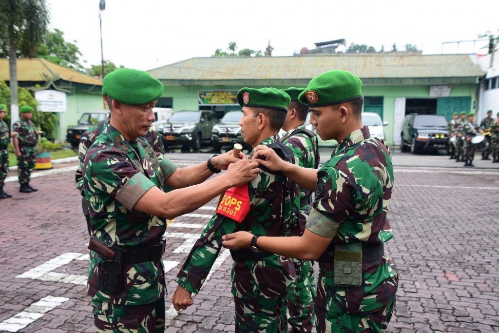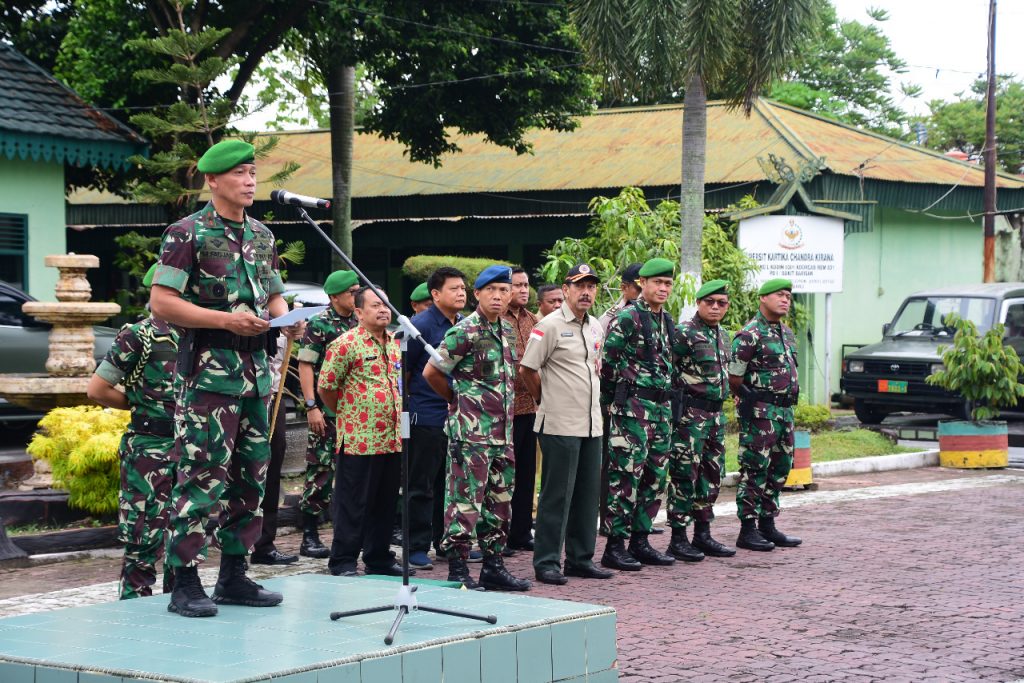 Pekanbaru, Indonesia – Danrem 031/WB Brigjen TNI Mohammad Fadjar, melakukan penanggalan tanda yang dikenakan peserta latihan. Penanggalan tersebut sebagai tanda berakhirnya Latihan Posko I Kodim 0301/Pekanbaru (Pku) Wira Bima Tanggap XXXIV tahun 2019.