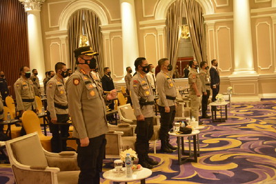 Pekanbaru, Indonesia-Dalam memperingati Hari Ulang Tahun (HUT) Satuan Pengaman (Satpam) ke-40 tahun secara serentak di Indonesia, Kepala Kepolisian Resor Kota (Kapolsekta) Pekanbaru, Kombes Pol H Nandang Mumin Wijaya SIK HM mendampingi Kapolda Riau Irjen Pol Agung SIE menghadiri HUT Satpam yang digelar secara virtual bertempat di Ballroom Hotel Royal Asnof, Kota Pekanbaru, Provinsi Riau, Selasa (2/2/2021).