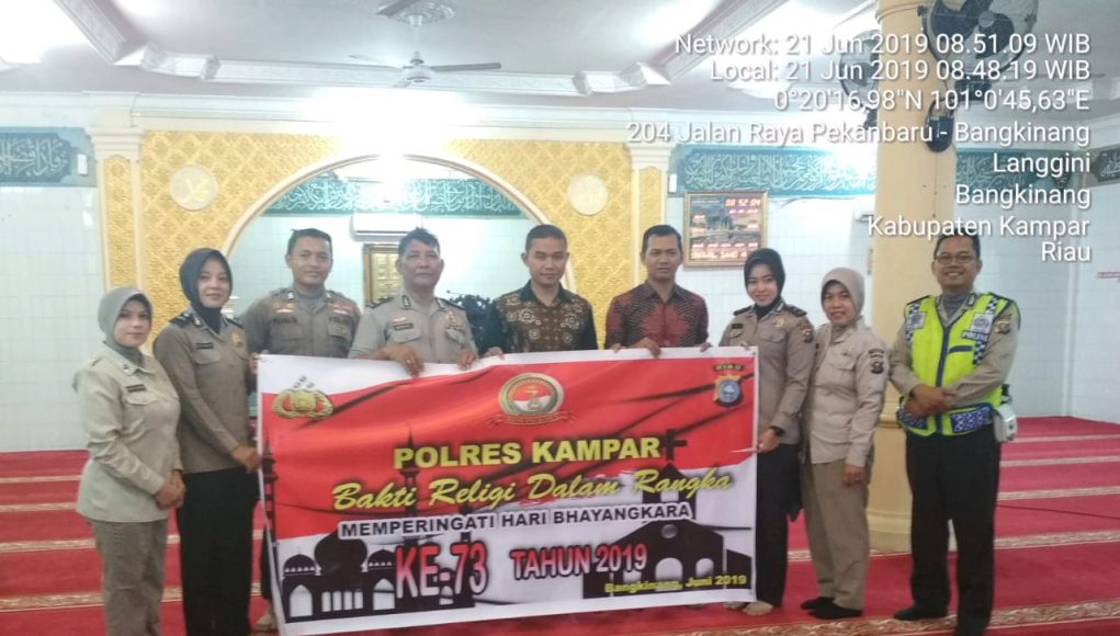 Kampar, Indonesia–Masih dalam rangka menyambut Hari Bhayangkara ke-73, jajaran Polres Kampar kembali menggelar kegiatan Bakti Sosial Religi dengan melakukan gotong royong (Goro) di Masjid dan Gereja pada Jumat (21/6/2019) pagi.