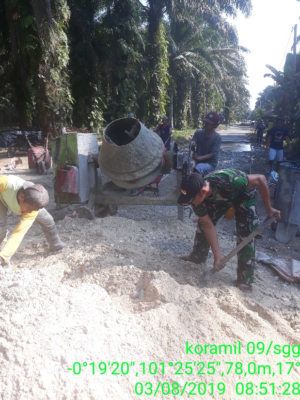 Babinsa bersama masyarakat saling bahu-membahu melaksanakan kerja bakti guna membangun jalan semenisasi agar masyarakat dapat melakukan aktivitas sehari-hari.